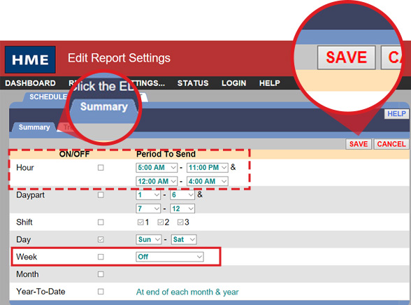 When all reports are selected and emails are saved, click on DASHBOARD to exit Edit Report Settings.